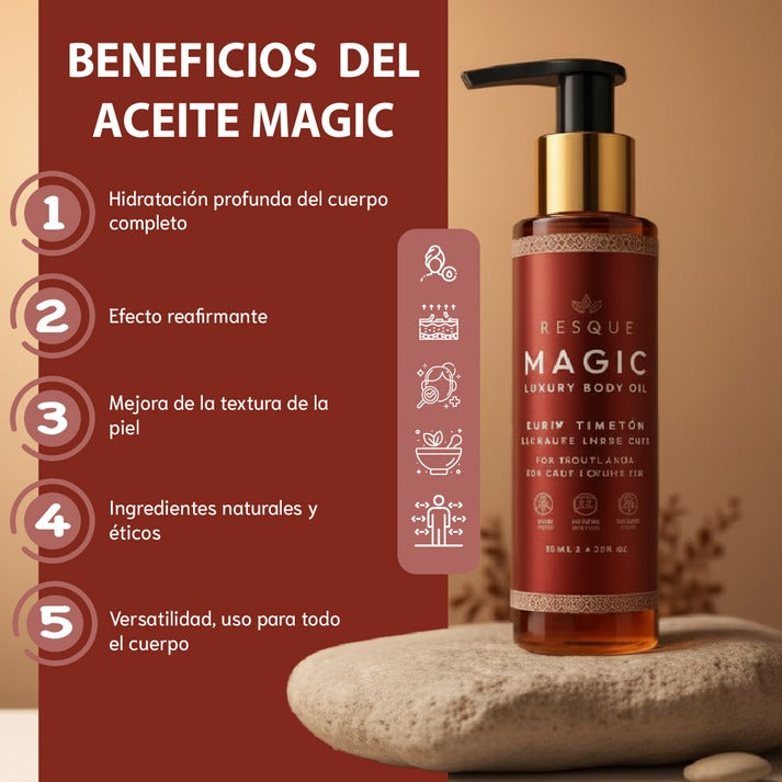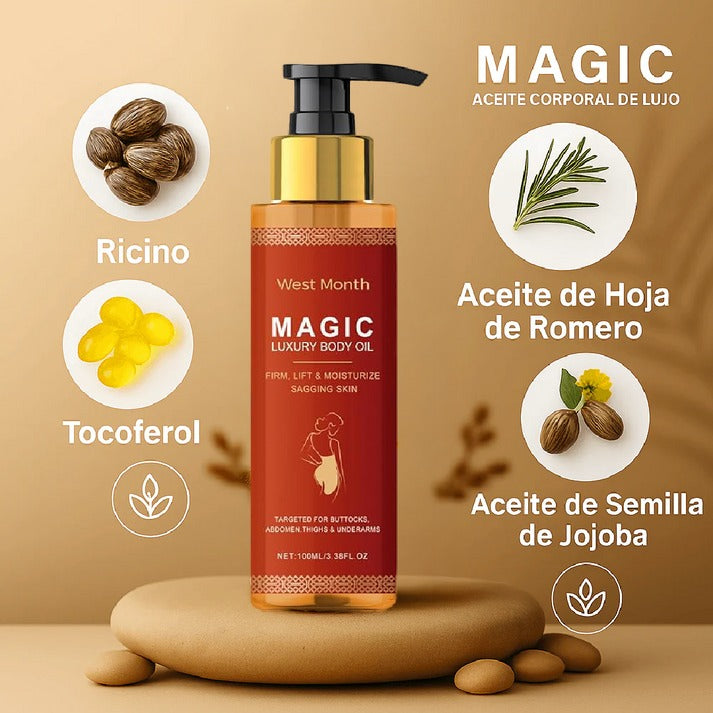 ACEITE CORPORAL MAGIC 100MLModelo universal: aceite corporal reafirmante mágico,modelo universal: aceite corporal reafirmante mágico, tratamiento hidratante reafirmante, 3,38 onzas líquidas, para glúteos, abdomen, muslos y axilas, el uso continuo puede mejorar la flacidez de la piel.Acerca de este productoFórmula de lujo: el aceite corporal contiene 7 aceites esenciales naturales prensados en frío para ofrecerte la mejor experiencia de cuidado de la piel y una experiencia verdaderamente lujosa. Hidratación profunda y reafirmante: contiene aceite de almendras dulces y crema de noche. El aceite de rosa hidrata profundamente, reafirma la piel, mejora la elasticidad de la piel, la hace suave y joven, y la mantiene hidratada y elástica. Revitalice la piel: el aceite de rosa mosqueta y la vitamina E actúan en conjunto para promover la regeneración de la piel, proteger y mantener la piel radiante y brillante, proteger contra la luz solar directa, retener la humedad y hacer quela piel sea suave y delicada. Calma la piel: el aceite de almendras y el aceite de lavanda pueden fortalecer la piel, revitalizarla, suavizarla, reducir la inflamación y promover la curación.Potenciador de colágeno: el aceite de pachulí puede aumentar la producción de colágeno natural, dejando la piel suave e hidratada, con piel naturalmente firme y radiante.